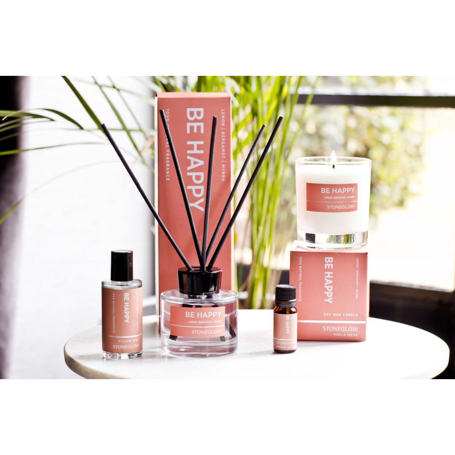 Диффузор Be Happy (Будь счастлив) из коллекции Wellbeing (Благополучие), аромат которого наполнит ваше настроение позитивом. Выполнен из 100% натуральных эфирных масел, специально отобранных за их бодрящие свойства. Содержит семь чистейших натуральных эфирных масел бергамота, мирры, лаванды, мяты колосистой, лимона, олибанума и петитгрейна.