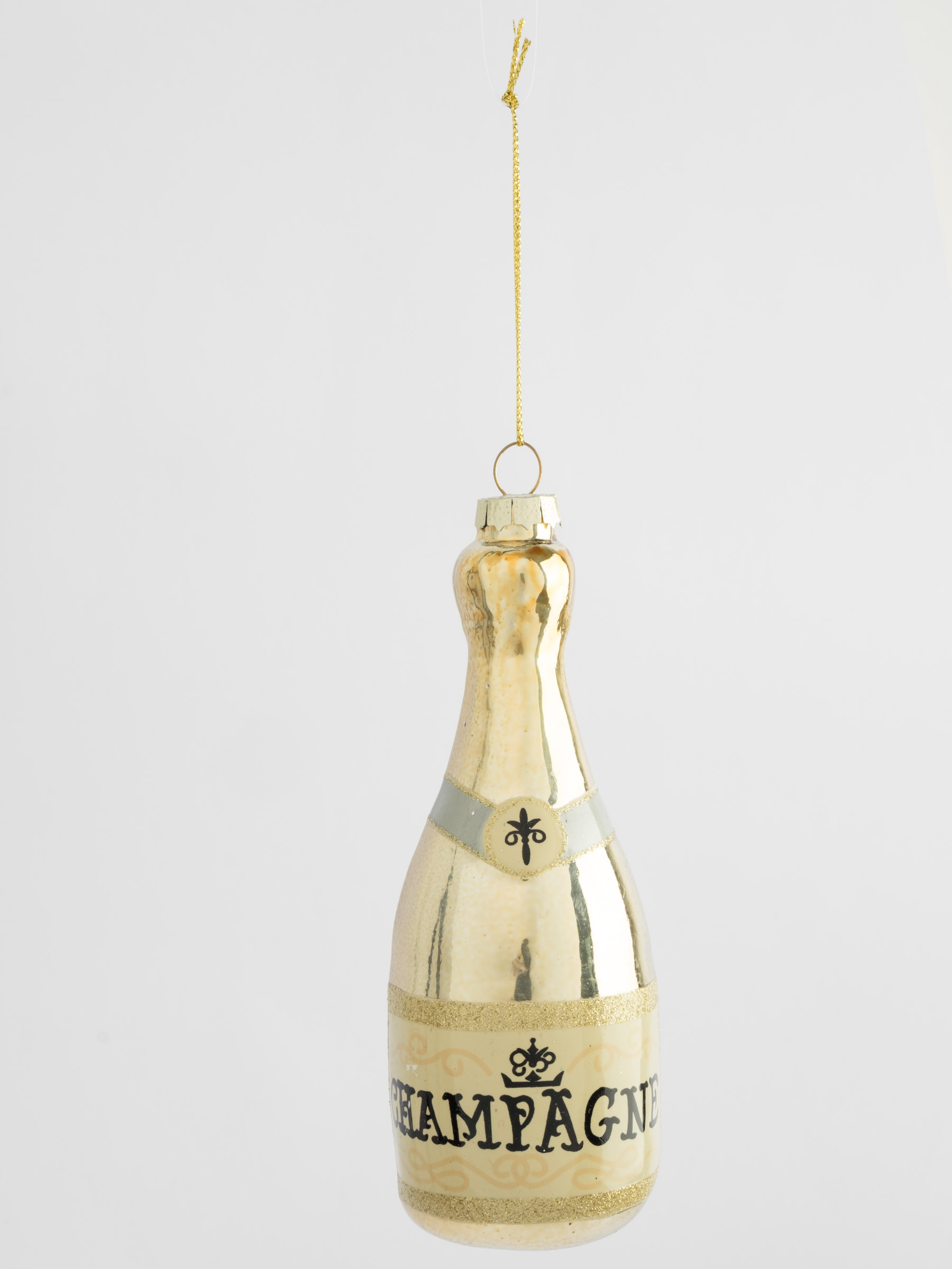 Украшение на ёлку из стекла, бутылочка шампанского, будет весьма эффектно смотреться в окружение шаров и фигурок на новогодней ёлке.