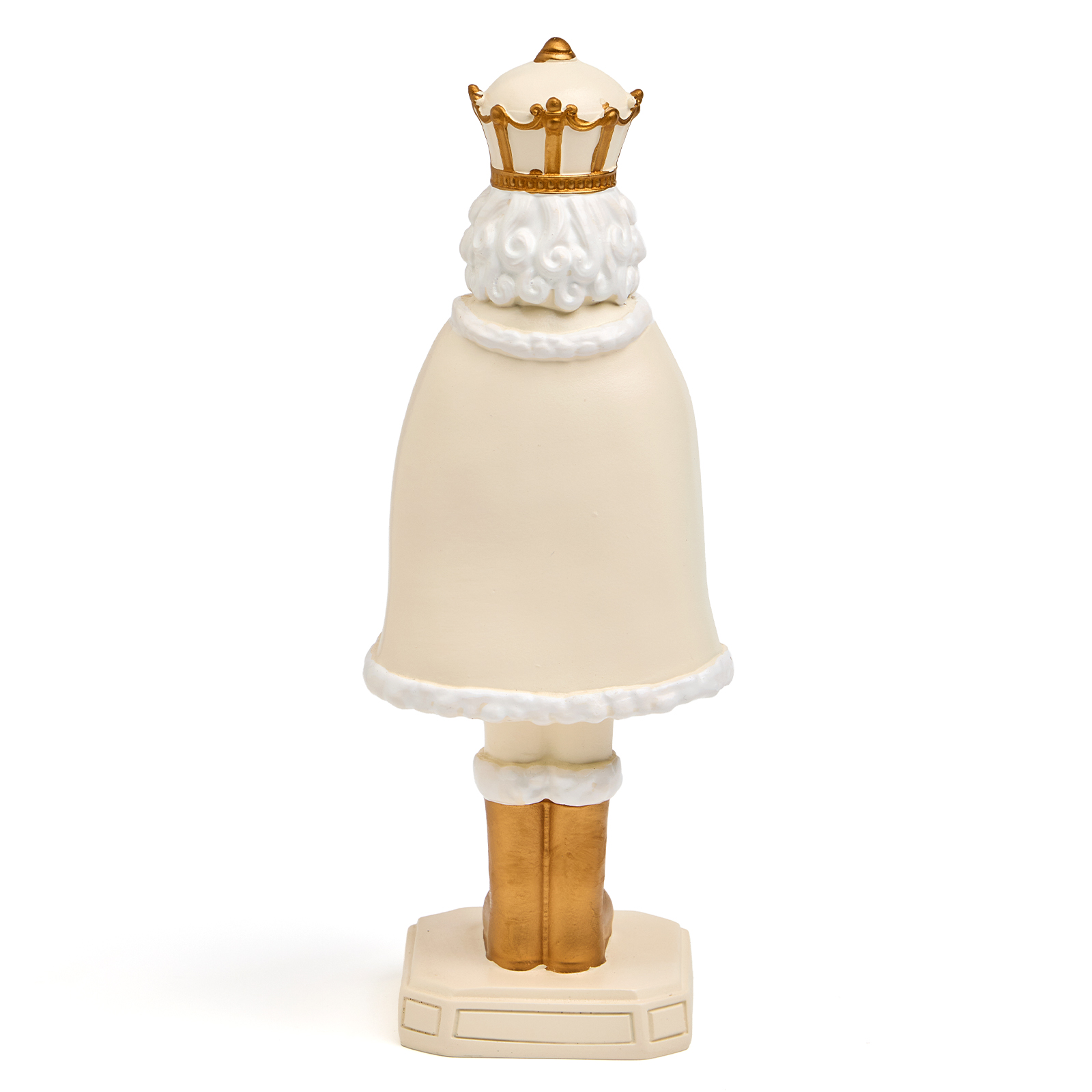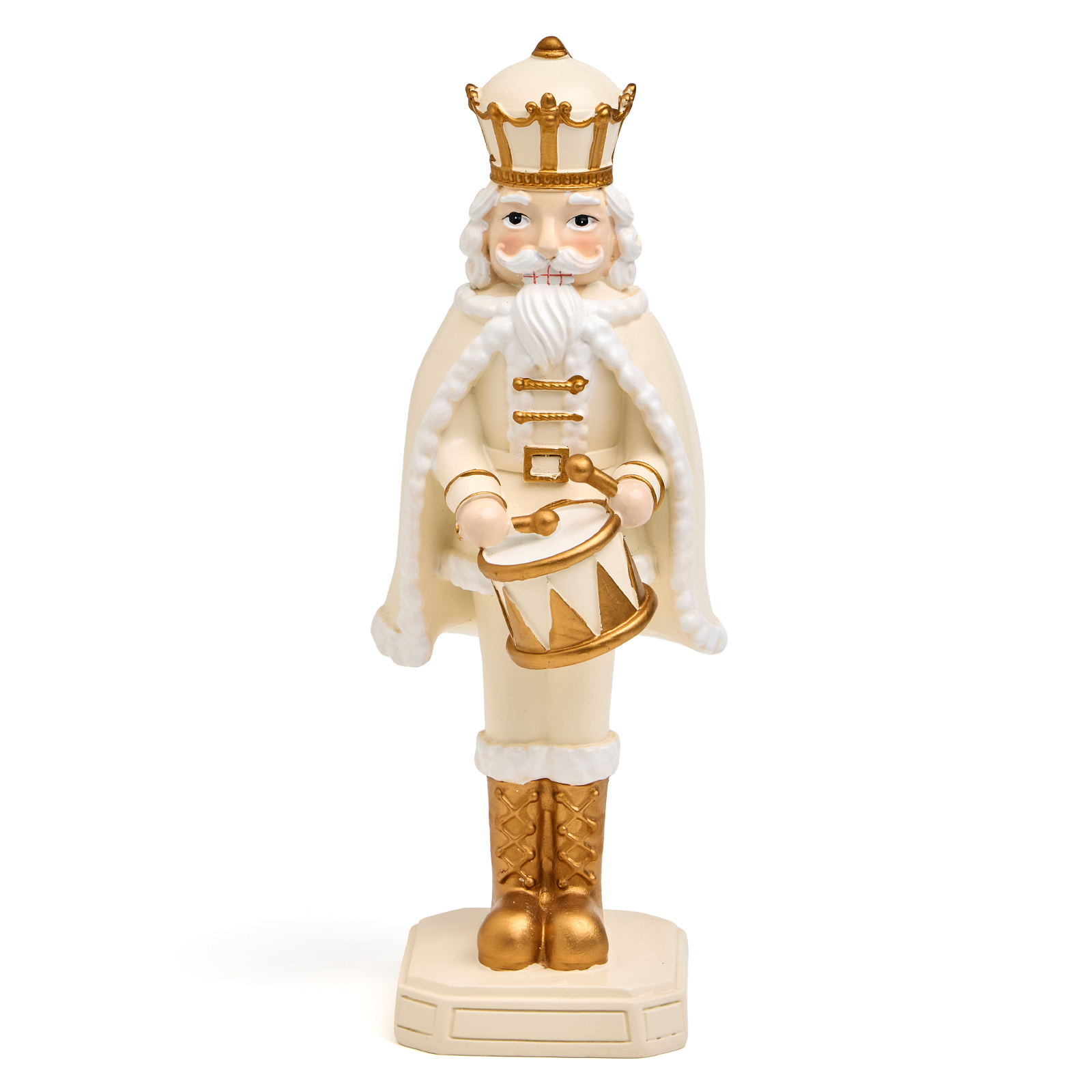 Новогодняя статуэтка "Щелкунчик" - он словно только что вышел из знаменитой балетной сказки: в короне, с пышным белым плащом, золотыми сапогами и барабаном в руках.