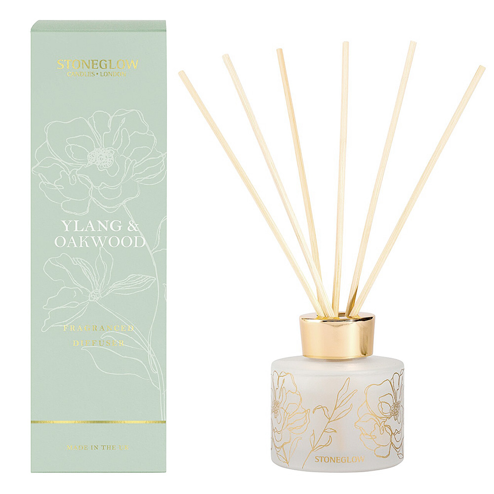 Диффузор Ylang&Oakwood (Иланг и лист дуба) из коллекции Day Flower (Дневной цветок). Согревающие ноты измельченных листьев дуба и сухого кедра, усиленные мягким жасмином, лилией и ярким илангом с оттенком цветов нероли.