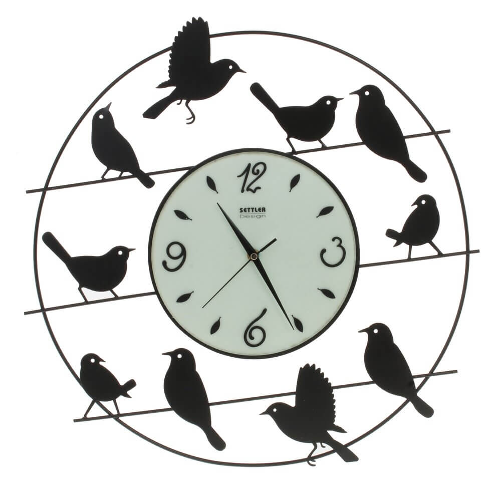 Оригинальные настенные часы в современном стиле. Круглый циферблат, диаметром 22 см, в металлическом обрамлении, украшенным фигурками птичек, имеет три стрелки - часовую, минутную, секундную. Цифры - арабские. Работают от 1 батарейки типа "АА" ( в комплект не входит). С задней стороны есть крепление на стену.