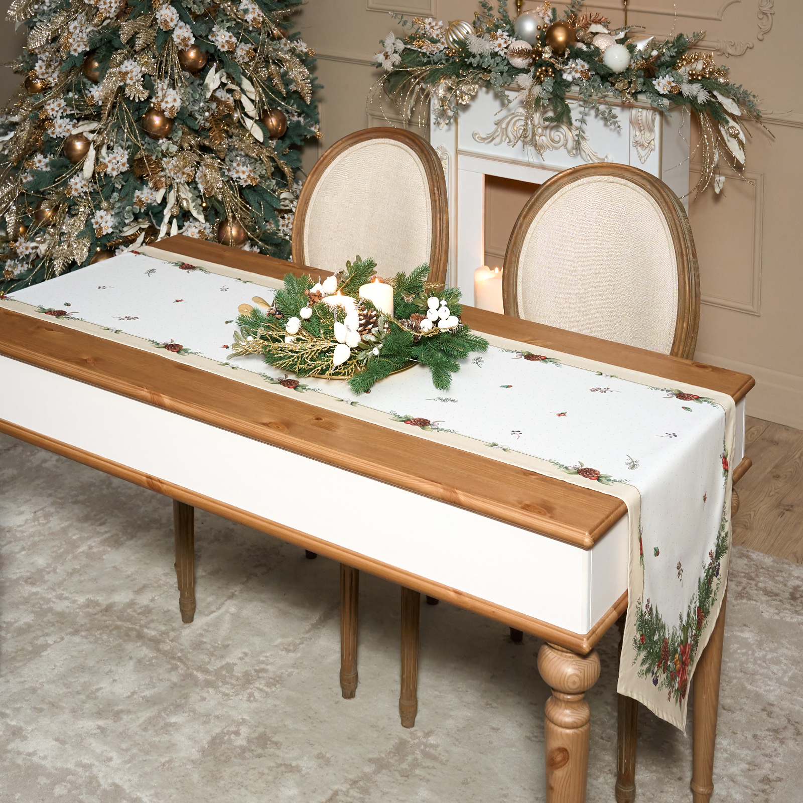 Новогодняя дорожка от Lefard из коллекции "Celebration" — эффектный элемент праздничного декора и практичное текстильное решение для сервировки столов. Идеально подойдёт на Новый год, Рождество и семейных торжеств. Новогодний принт с еловыми веточками, шишками и пуансеттией нанесён методом цифровой печати — не тускнеет и сохраняет насыщенность даже после длительного использования. Раннер оформлен симметрично с обеих сторон, что делает его эффектным акцентом сервировки. Благодаря водоотталкивающей пропитке поверхность не впитывает влагу, а капли воды легко удаляются салфеткой.