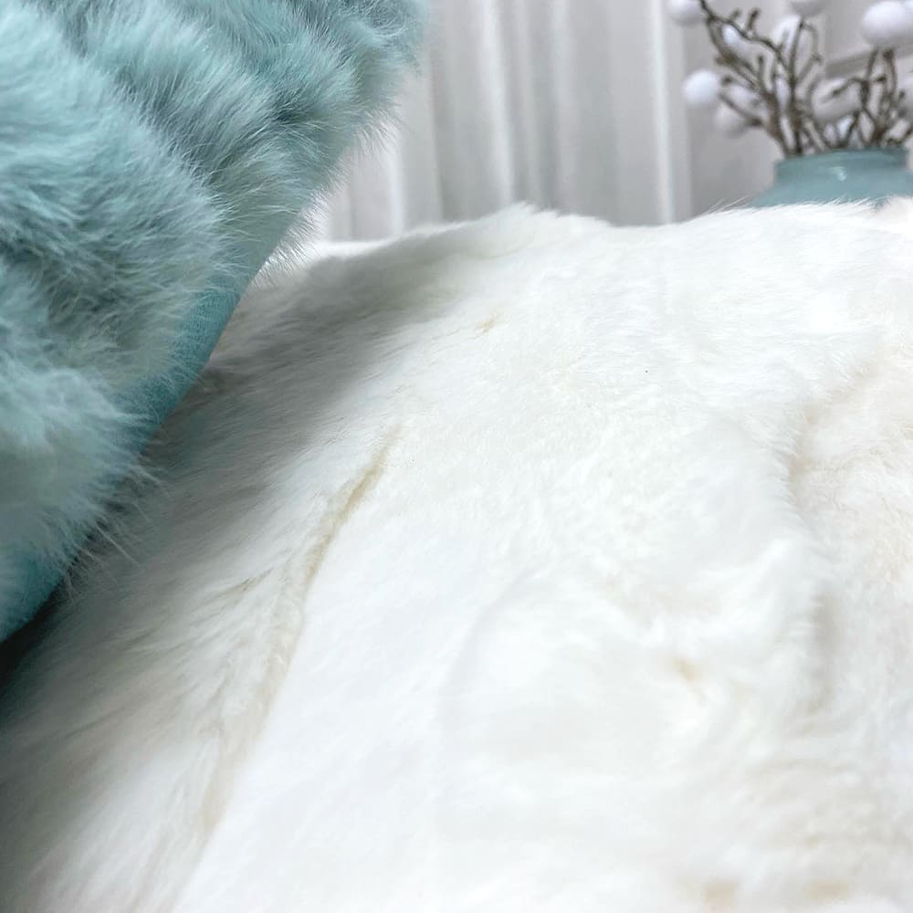Лицевая сторона подушки из меха кролика в белом цвете. Обратная сторона из бархатистого полиэстера.